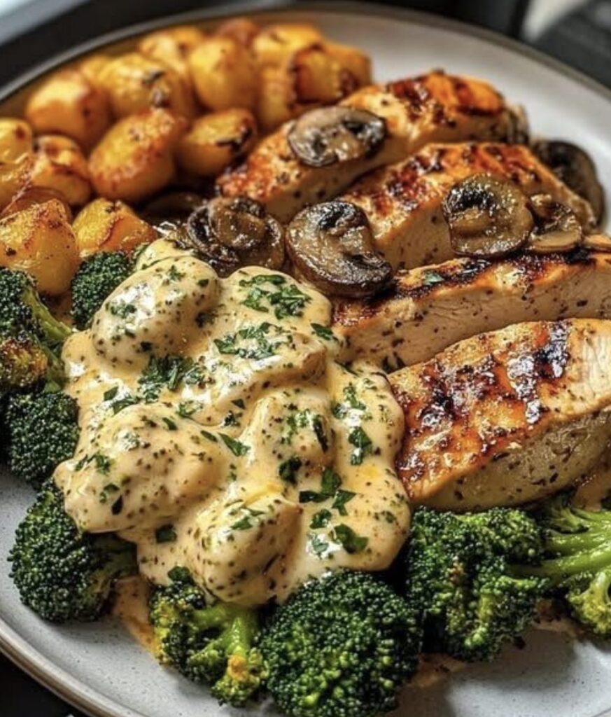 A delicious plate doesn’t just happen—it’s composed. This dish, Grilled Chicken with Mushroom Cream Sauce, Herb Gnocchi, Roasted Baby Potatoes & Steamed Broccoli, is one such masterpiece. Balancing flavor, texture, and nourishment, it’s the epitome of what a comforting yet refined meal should be. The sizzling char of grilled chicken, the richness of the mushroom cream sauce, the herbaceous gnocchi, crispy golden potatoes, and vibrant green broccoli all work in harmony to create an unforgettable culinary experience.