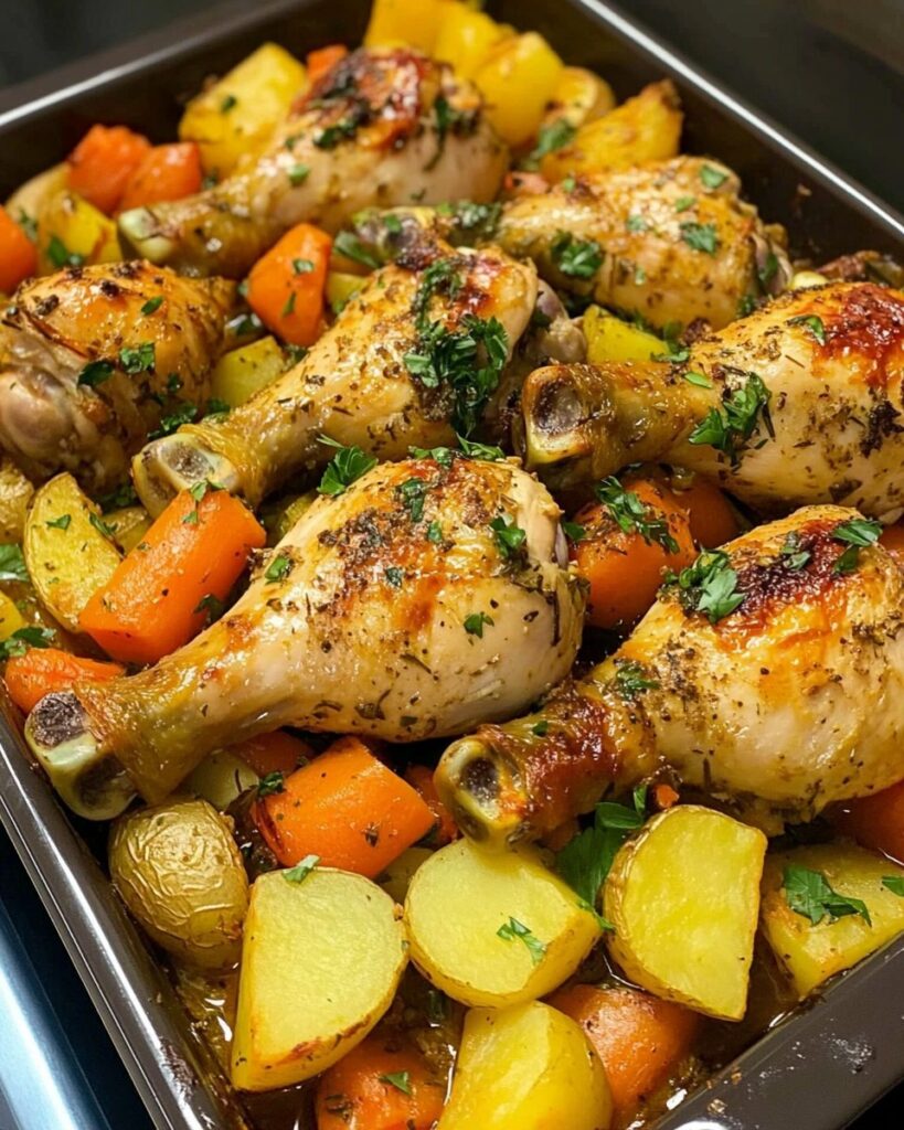 In a world of fast food and overcomplicated gourmet meals, Juicy Baked Chicken Legs with Garlic Potatoes & Herby Carrots reminds us of the power of honest, home-cooked food. With only a few simple steps and wholesome ingredients, you can serve up a meal that’s equal parts satisfying and nourishing. Whether you’re feeding a hungry family or cooking for yourself, this one-pan wonder delivers on flavor, ease, and comfort.